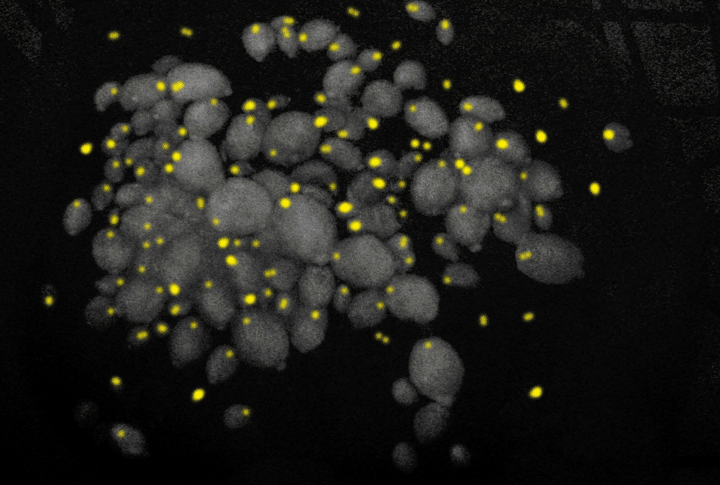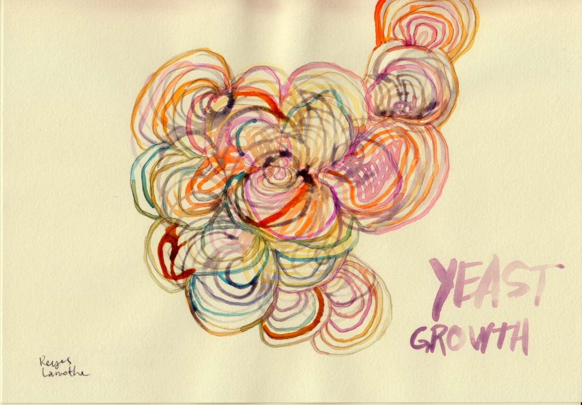 A watercolour representing the cochineal insect as it groups in a cactus painted with a dye derived from it was used as a starting point (www.eric-reyes.com/cochinilla). Amazingly, with a little help, they look like yeast cells under a microscope.